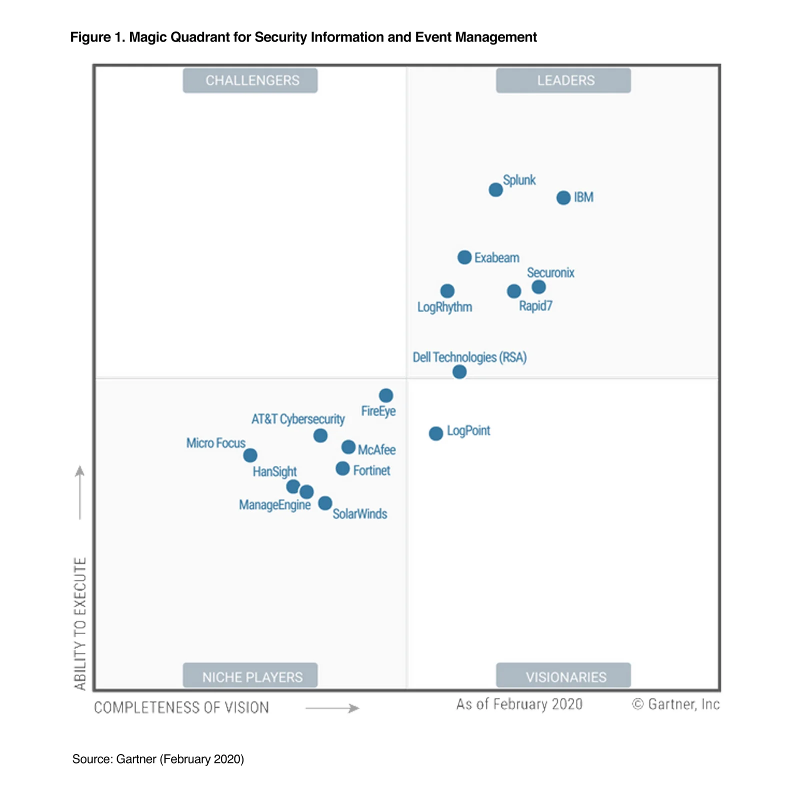 Source: Gartner “Magic Quadrant for Security Information and Event Management” By Kelly Kavanagh, Toby Bussa, Gorka Sadowski, February 18, 2020.