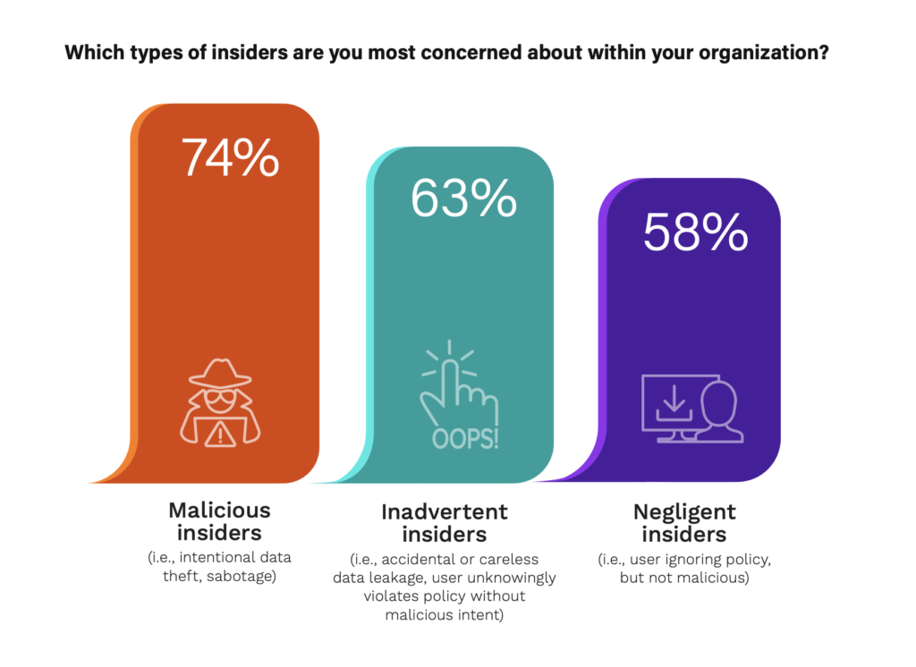 While our survey found that organizations are concerned about these categories, 74% of respondents are most concerned about malicious insiders.