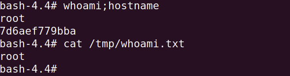 With the payload encoded properly (we’ll get to this later), the URL can be placed into a browser or run with a command line utility such as curl. No output is generated once the full URL is executed, however if we were to inspect the target host, we would find a newly created file “/tmp/whoami.txt” with the text “root” which provides proof that our RCE exploit was successful.