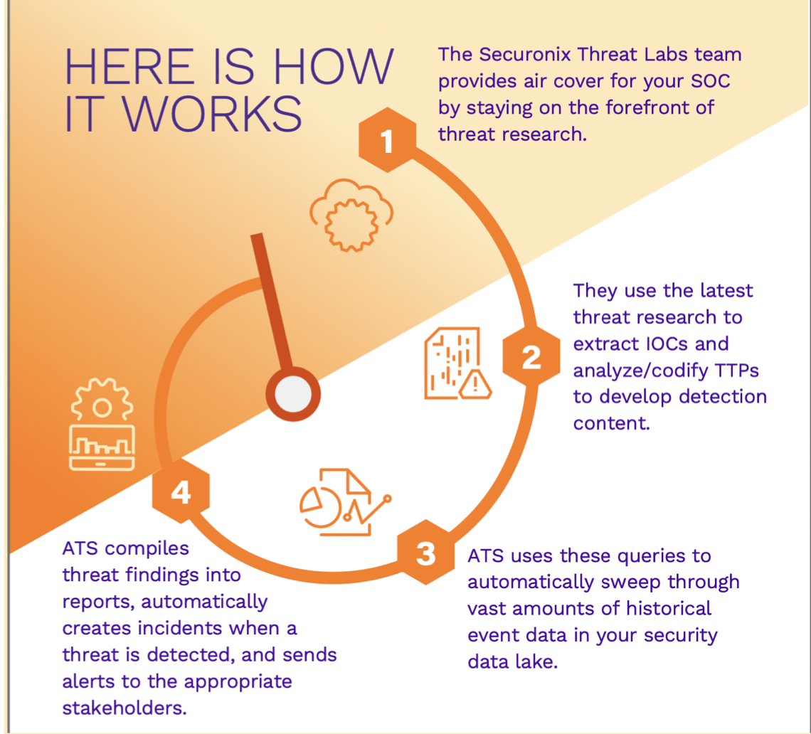 ATS leverages the latest threat research from Securonix Threat Labs to automate assessing your exposure and initiating incident response. Combining human-driven threat intelligence curation with autonomous and automated post-hoc detection, it empowers your team with the ability to