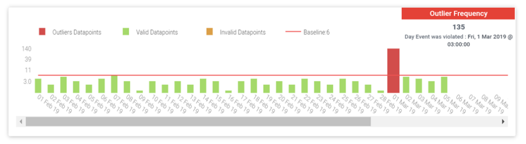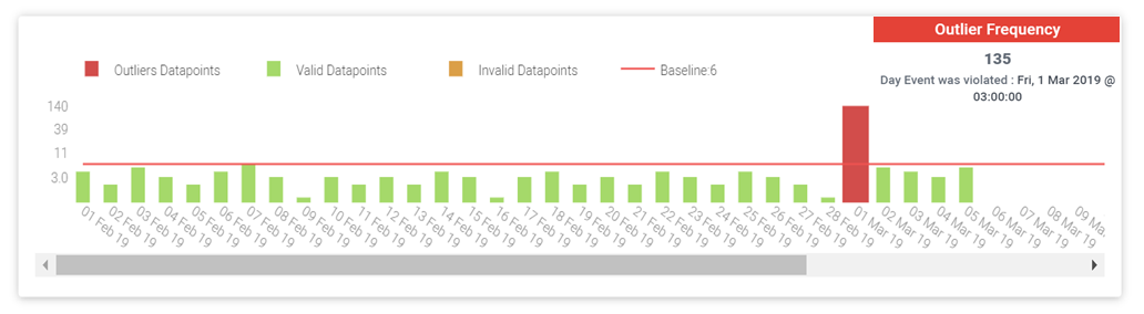 In the example below we have a baseline of failed logins per day for a user. As you can see, the average number of failed logins per day is around 5. Yet, on the 1st of March, there were 135 failed logins.