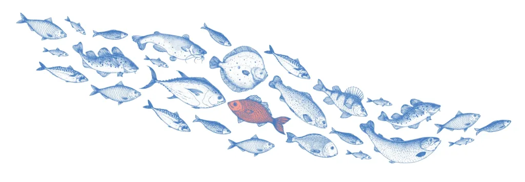 In security, behavioral analytics allow you to find anomalous behavior which could point to an attack. For example, look at the school of fish in the picture above. Can you find the fish behaving oddly? Take a second or two and you’ll find them.