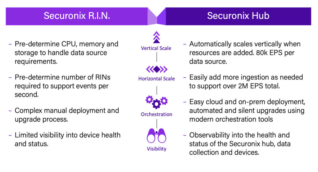 As our customers deploy more and more RINs to support their growing environments, we had to rethink how the ingestion function was deployed and managed. With the recent announcement of the Securonix Unified Defense SIEM, Securonix also introduced Securonix Hub, our new cloud-based/virtual ingestion device, that will take the data ingestion and response function to the next level. Securonix Hub is built on modern orchestration and deployment technologies that enable functionality that aligns to the ingestion demands of today and tomorrow. You can now gain advance capabilities not available in previous Securonix ingestion nodes in the following areas: