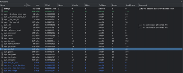 Opening one of the random samples will occasionally provide us with function names that are clearly defined. This is great because it provides high-level information about BPFDoor’s overall functionality. Some particularly interesting function names are getshell, getpasswd, icmpcmd, shell, set_proc_name, and sendcmd to name a few.