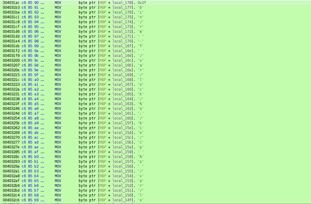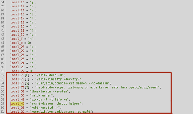 Some of the samples we analyzed were more obfuscated at a binary level than others. In some cases, strings were broken out into individual variables and hex encoded. Once decoded, some individual commands can be seen. This particular sample writes to the /var/lock directory.