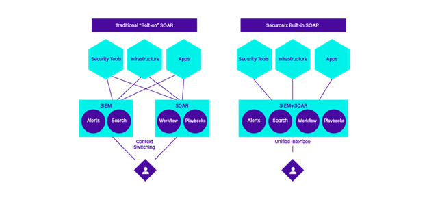 Securonix SOAR blends seamlessly with our existing Next-Gen SIEM and Open XDR offerings, providing analysts with a single workflow to cover threat detection and response. Many SIEM and SOAR vendors claim to have a converged solution, but often the SOAR is not native, resulting in context-switching and complexity for analysts. Unlike many SOAR products in the market, Securonix SOAR is built-in the SIEM, not bolted on, allowing analysts to respond to threats at scale with minimal noise and less manual effort.