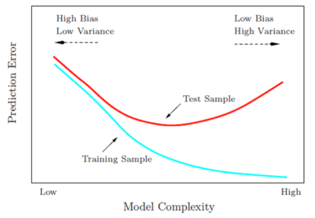 In order to ensure the model generalizes well to new data, we need to avoid overfitting the training data. By increasing the complexity of the model, we can keep decreasing the error on the training sample, but at some point the model can become too specific to the training data, losing generalization quality, and the error on the test sample starts to increase. Finding the optimum where both training and test errors are low is the bias-variance tradeoff: