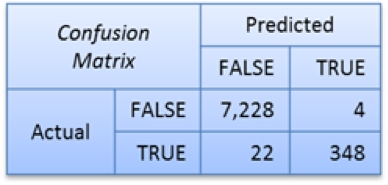 The model was tuned using 10-fold cross-validation on 18,000 labeled data points. Despite seriously imbalanced training data (only 5% labels were positive), predictions on 7,600 test cases (excluded from training) were extremely accurate, as shown in the confusion matrix below: