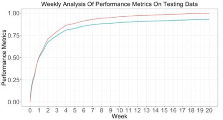 In this example of the classifier application, we were fortunate to have a large number of labeled cases to train the model. While the model is portable between different customers, the context at each new customer is different, as well as the analyst’s expertise that the algorithm is trying to capture; therefore, the classifier has to be trained in the specific customer environment. To evaluate classifier performance when only a fraction of labeled data is available, as is most likely to be the case in real-world applications, we simulated training dataset growing over time. Impressively, in only two weeks of training classifier achieved 70% of the maximum accuracy; at 6 weeks, it was over 90%: