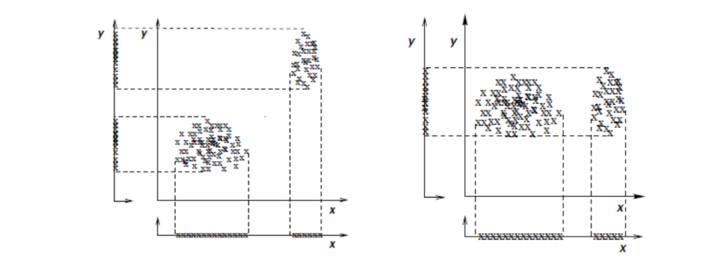 Example of redundant feature (left: feature provides the same information as x) and irrelevant feature (right: feature does not discriminate between the clusters defined by x). http://www.jmlr.org/papers/volume5/dy04a/dy04a.pdf
