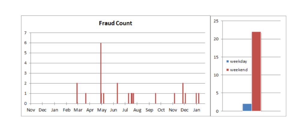 Timeline of fraudulent activity (left) and its breakdown by day of the week (right)