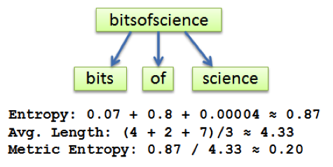 where p_i is a ratio of the number of dictionary words of length i over total number of possible character permutations in the string of the same length. Here’s an example of the calculations: