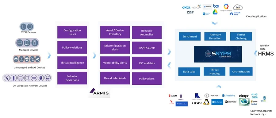 This integration combines the unparalleled visibility into IoT and unmanaged devices provided by the Armis platform with managed asset information from other data sources. By correlating Armis asset data with data from other sources, Securonix enables appropriate actions across the network, such as blocking beaconing traffic from infected IoT devices. Securonix’s highly scalable and economical storage also enables the retention of important Armis data for compliance and threat hunting.