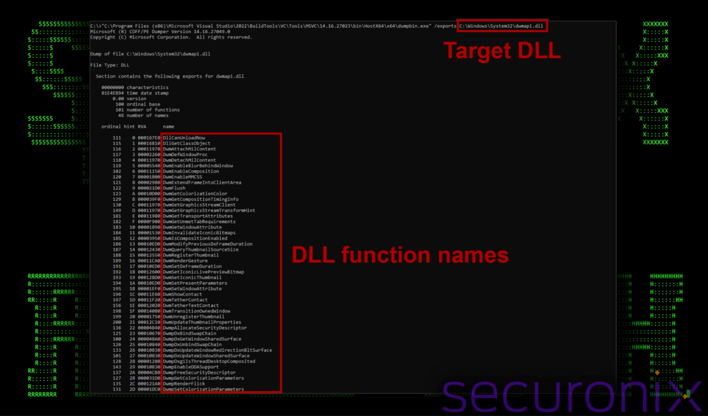 First, let’s identify the target import functions. For this we can use the dumpbin.exe application which is packaged with Visual studio. Using the /exports flag, and then specifying our victim DLL, we can discover all ordinals, and function names associated with dwmapi.dll