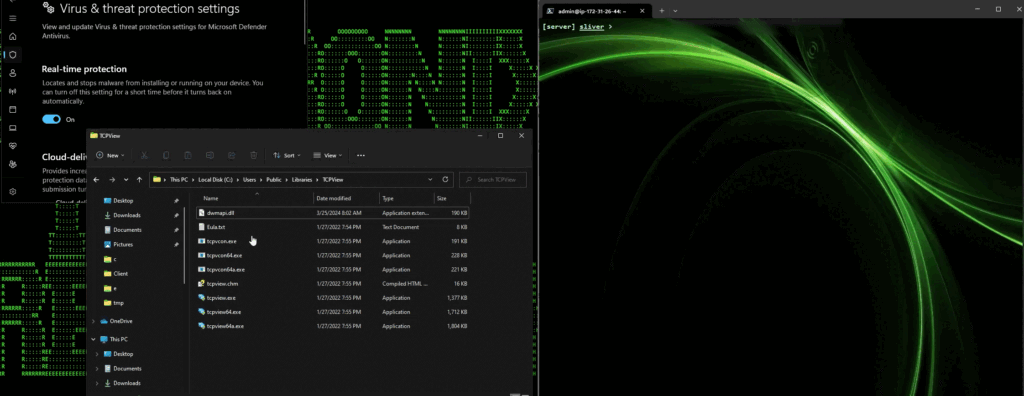 As you can see in the figure above, our Sliver session on the left received a session from our custom-built dwmapi.dll. The DLL was successfully loaded and its code was executed through tcpview64.exe. Not only that, but this was also on a fully patched Windows 11 installation with Windows Defender enabled and running in the background.