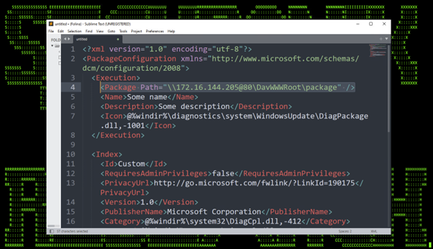 When the XML-based .diagcfg file is loaded, the “Path=” variable is loaded and read by sdiageng.dll. This could be a WebDAV connection to a remote machine hosting the malicious .exe file under the attacker’s control. Figure 1 contains an example of this file structure.