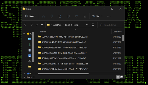 After the WebDAV server is accessed by sdiageng.dll in MSDT, temporary files are created on the victim’s machine. The interesting thing that happens here is that file names present on the WebDAV server will be downloaded into the newly created folder found in:C:\Users\victim\AppData\Local\Temp\. Folders will have a random file name beginning with SDIAG_ pictured in Figure 2: