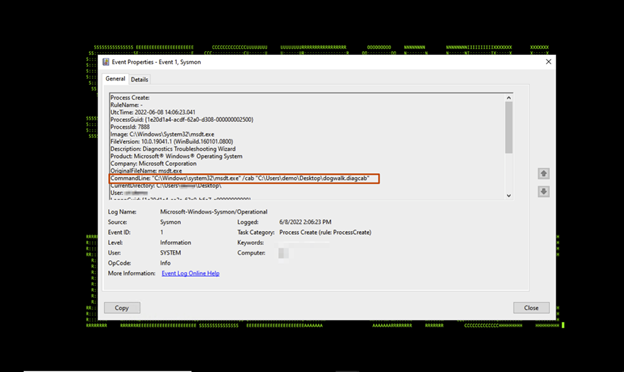 One method can be taking a look at the CommandLine for msdt.exe process execution. As we can see when executing the .diagcab below in Figure 4, the name of the diagcab file is present at the end of the command string.
