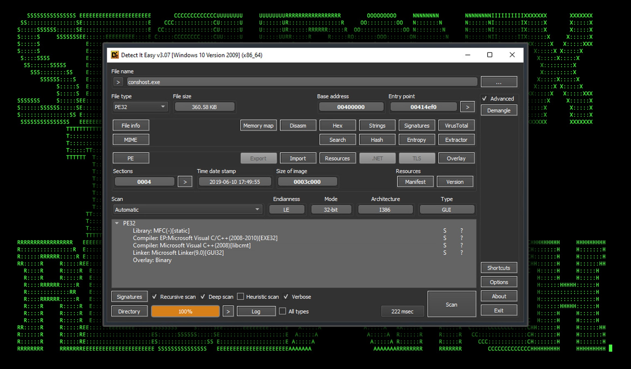The file “conshost.exe”, which is likely masquerading as the Windows binary “conhost.exe” stands only 360kb and is compiled using Microsoft Visual C/C++.