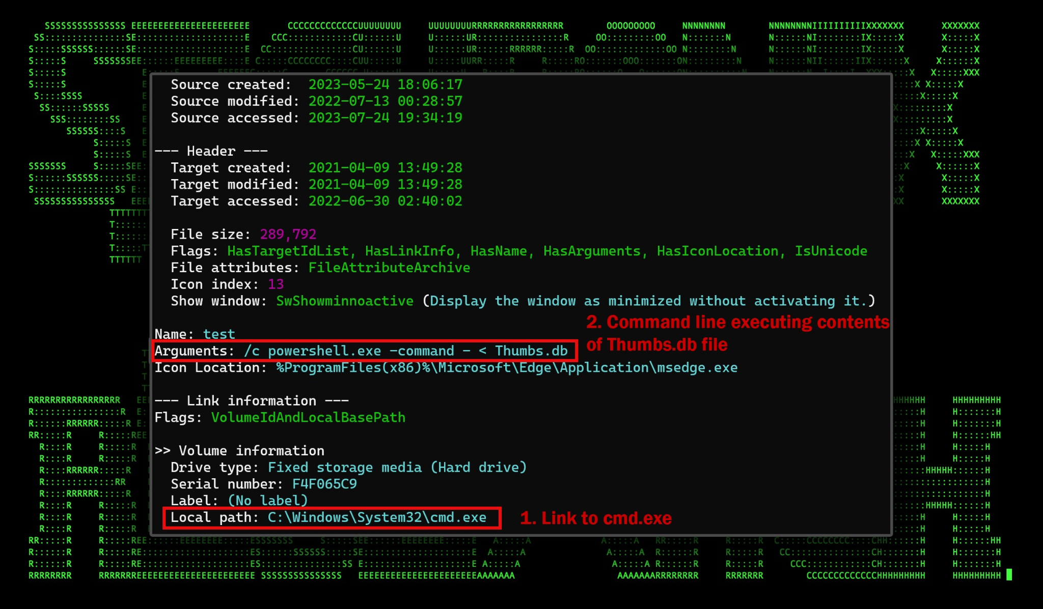 In our case, this Thumbs.db file is not storing image thumbnails, but contains PowerShell code executed by the shortcut file. Analyzing the shortcut file, we get a better understanding of how this works: