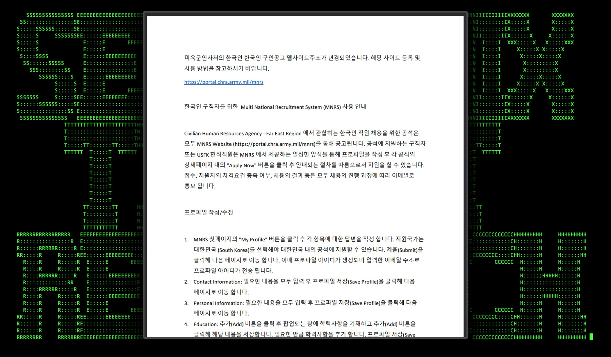 The Securonix Threat Research (STR) team has been monitoring a new attack campaign tracked by STR as STARK#MULE. The campaign appears to be targeting Korean-speaking victims based on the nomenclature and names of documents used, and based on the contents of the lure document. There is a possibility that the malicious threat actor (MTA) originates from North Korea (this is still to be confirmed). In this case, the documents suggest they contain information regarding US Army/military recruitment resources. It appears the goal is to spark the recipient’s curiosity enough to have them open the attached documents, and inadvertently execute the contained malware.