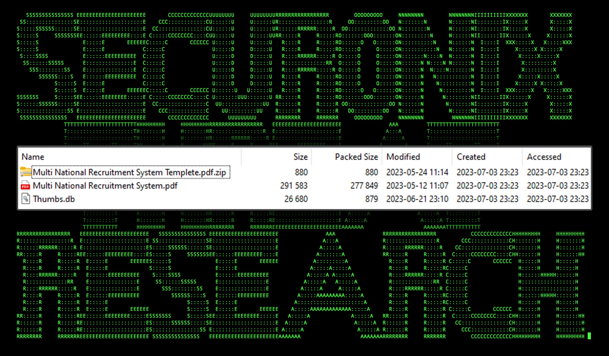 Embedded inside another zip file is another zip file named “Multi National Recruitment System Templete.pdf.zip”. The awkward usage of “Multi National” and typos such as “Templete” [sic] further solidify that the author(s) were of non-English origin or a possible false-flag attempt.