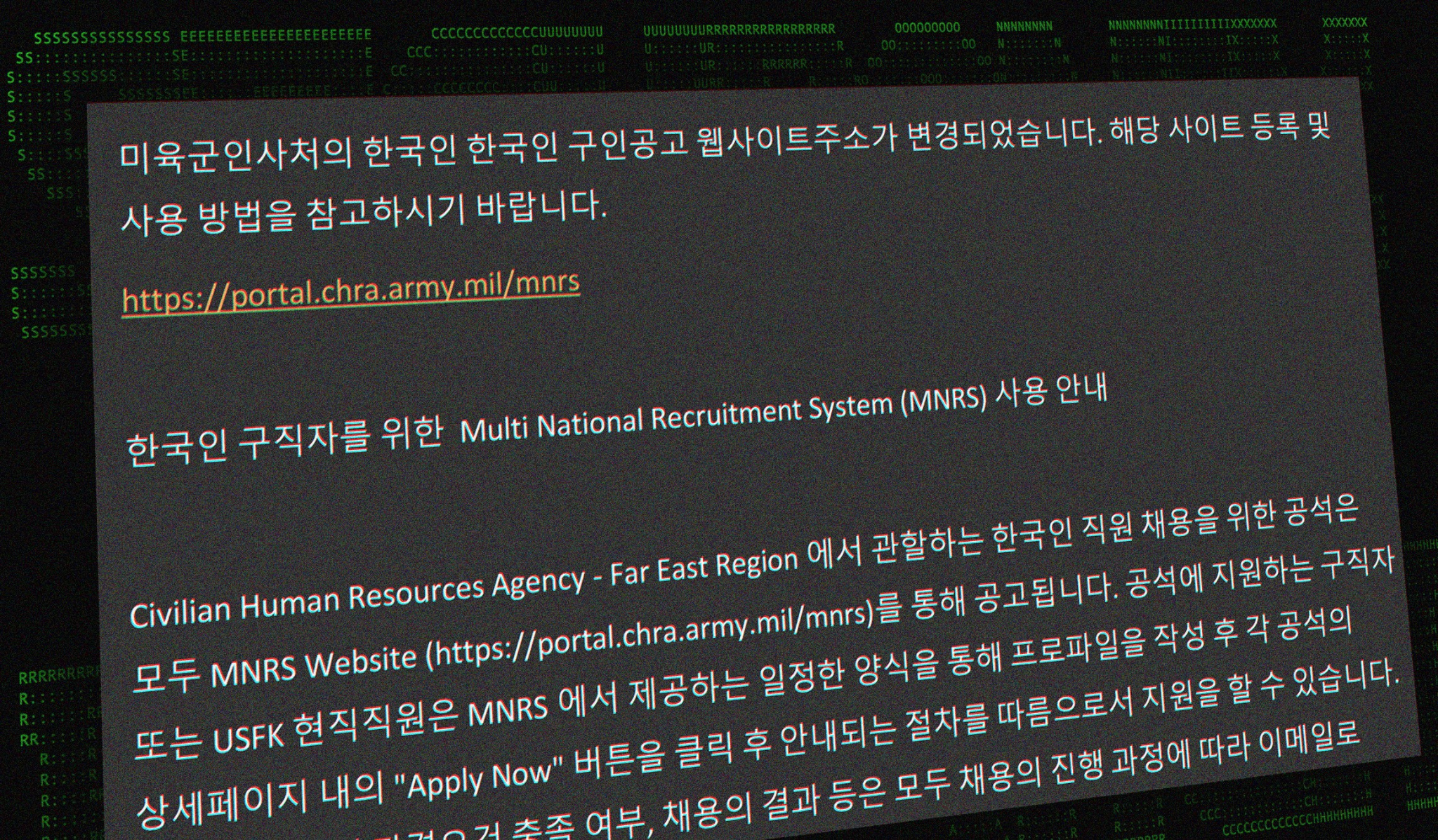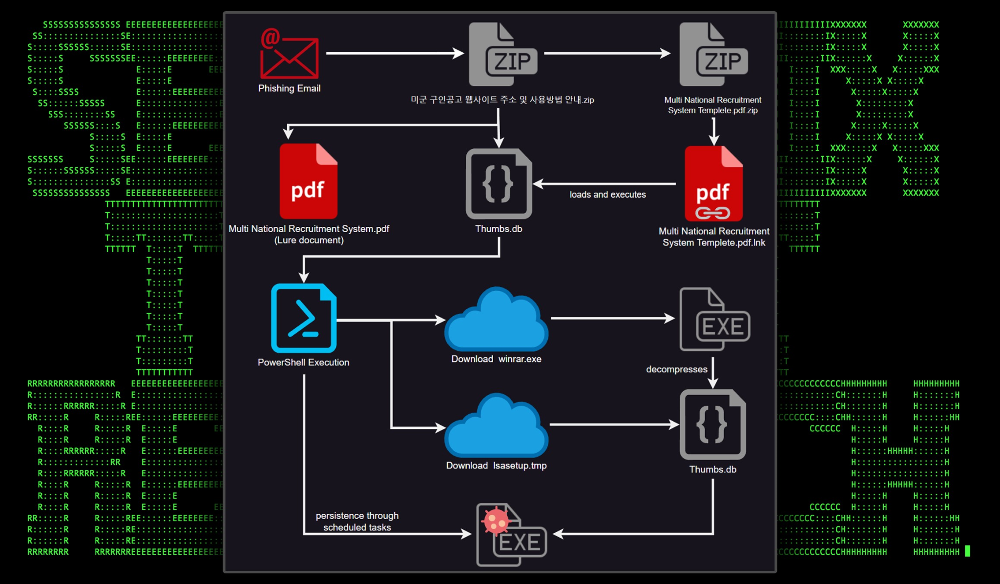 The attack likely begins with a phishing email with a zip file attachment. In our case, the zip file we were able to obtain and analyze was: “미군 구인공고 웹사이트 주소 및 사용방법 안내.zip”, which translates to “U.S. Army job posting website address and how to use it”.