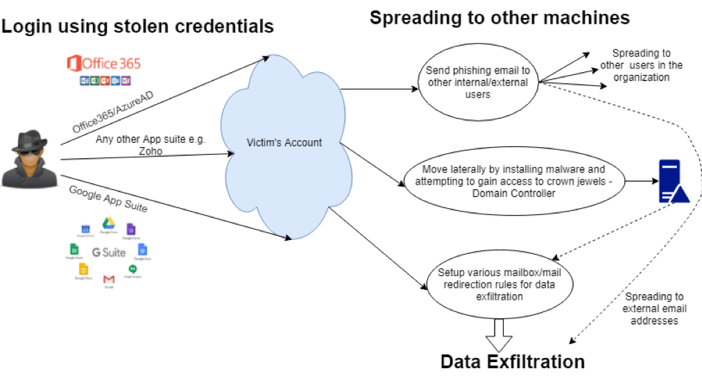 In cases where an app suite such as Office 365 is linked to Active Directory (Azure AD), the attacker could access the organization’s cloud desktop infrastructure. Then the attacker can move laterally using techniques like pass the hash or pass the ticket. Once the attacker has found a critical target such as a domain controller or a member server, the organization’s infrastructure is their oyster, and only their imagination limits what they can do.