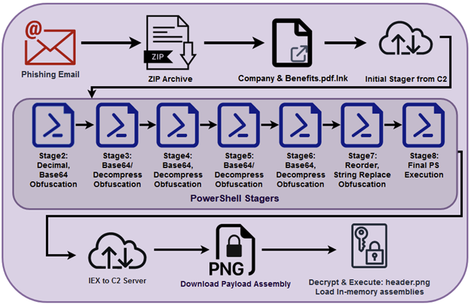 Once the .lnk file is executed by the user, a rather large and robust chain of stagers will execute. Each stager is written in PowerShell and each is very heavily obfuscated. In total we observed eight layers to the stage which carry a wide range of techniques.