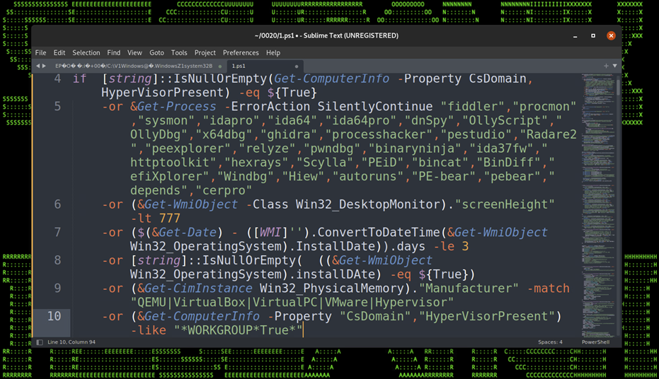 Native PowerShell commands are used for two more checks, one looking for Win32_PhysicalMemory property for memory matching “QEMU|VirtualBox|VirtualPC|VMware|Hypervisor“. Get-ComputerInfo is then used for computer properties containing (“CsDomain”,”HyperVisorPresent”) -like “*WORKGROUP*True*“. This checks for the presence of a hypervisor or a non-domain joined system.