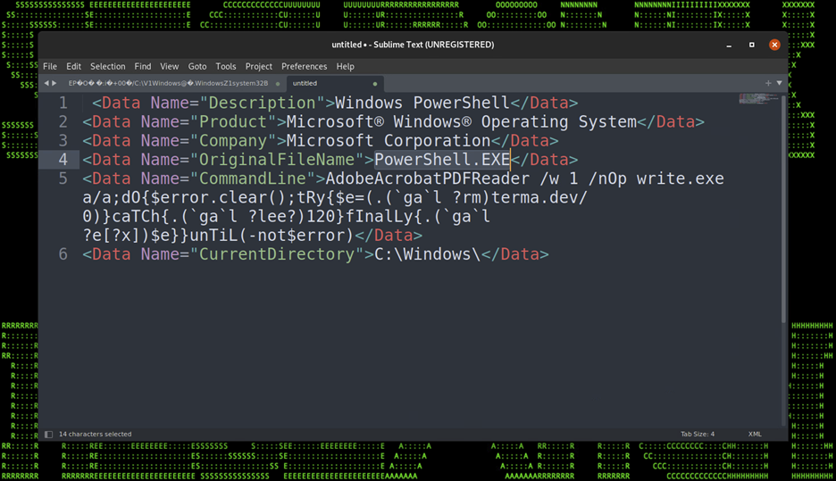 It then takes the powershell.exe executable file and then copies it to C:\Windows, renames it to AdobeAcrobatPDFReader, and then uses it to execute the rest of the PowerShell string. Logs generated from Sysinternals Sysmon identify this in figure 3 below.