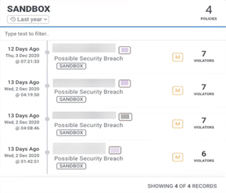 Analytics Sandbox helps in defending against unknown attacks, threats that have never been seen before or match any known malware on file. For example, even though standard email filters can scan emails for dangerous senders, file types, and URLs, zero-day threats can still pass unnoticed, bypassing traditional filtering. Analytics Sandbox gives a higher level of confidence, especially when a malicious email manages to get past your provider’s filters. The Analytics Sandbox widget contains all the policy violations that are used in your environment to experiment with, fine-tune, and develop policies against. Policy violations in the Sandbox widget are completely isolated from your live production environment, which means any action performed by the policy does not affect production or contribute to risk scores. For example, if a malicious email gets past your filters, then you can test new policies in Securonix Analytics Sandbox to figure out how to better catch that threat next time.