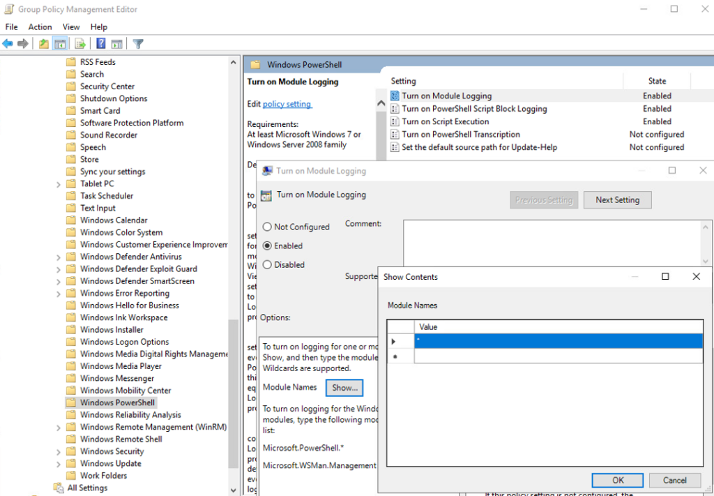 - In the “Windows PowerShell” GPO settings, set “Turn on Module Logging” to enabled.