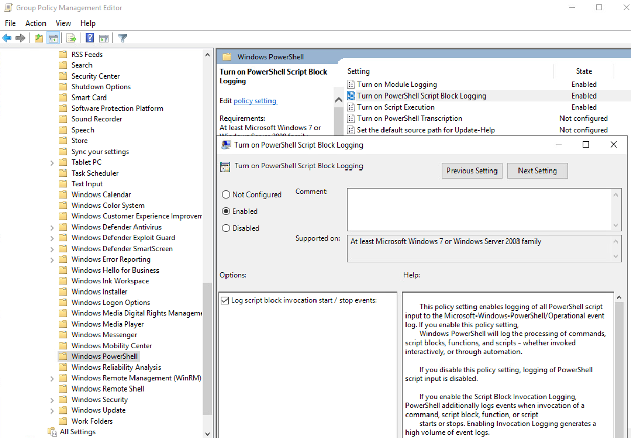 - In the “Windows PowerShell” GPO settings, set “Turn on PowerShell Script Block Logging” to enabled.