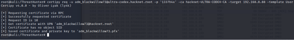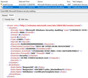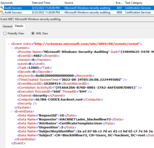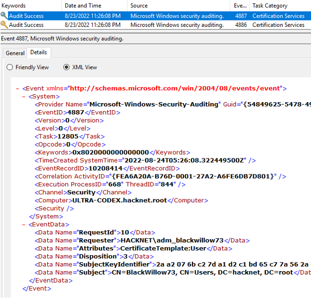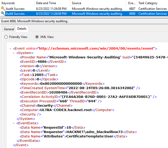 Certipy ‘req’ command requests certificates over RPC and the authentication is completed with NTLM over SMB for this phase. This stage also generates a 4886 (Certificate Services received a certificate request) event followed by a 4887 (Certificate Services approved a certificate request and issued a certificate) event. To enable these logs requires quite a bit of setup on the Certificate Authority server assigned the AD Certificate Services role.