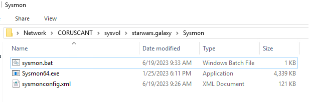 If you want to auto-deploy Sysmon with these scripts, download Sysmon, create the bat script and sysmonconfig.xml, and place all three in your domain’s sysvol directory on the domain controller which manages the segments of your network you want to monitor. Here’s an example: