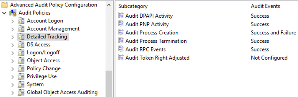 The following settings are the default Audit Policies used in one of our malware detonation chamber labs for high visibility feedback from our servers and workstations. This configuration is modified specifically in our Default Domain Policy but can be targeted to specific systems using GPOs.