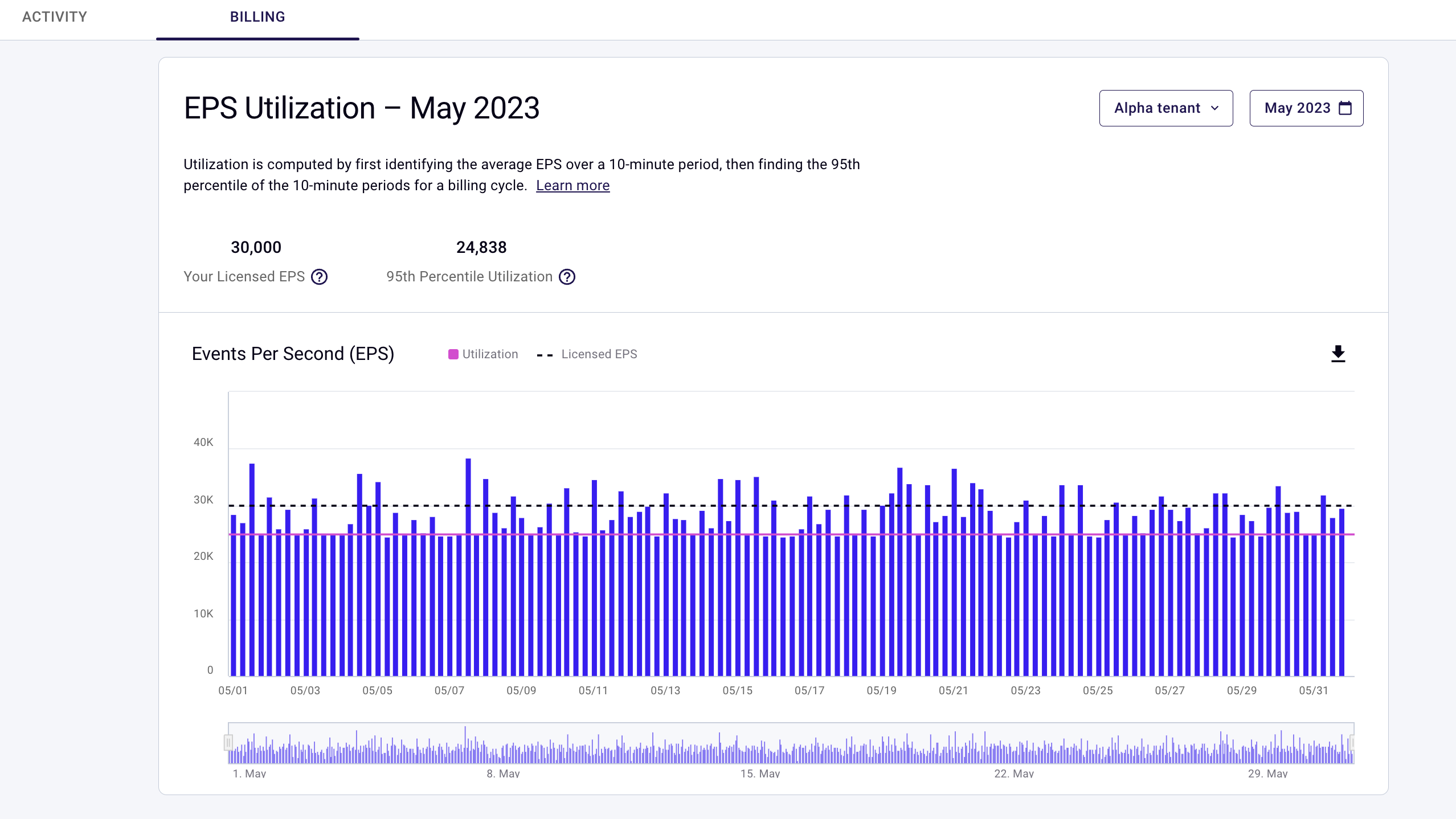 • License/Billing Overage Dashboard​: Your Securonix dashboard now displays usage data for the current month and previous months against your licensed EPS entitlement. The licensing/Billing Overage Dashboard gives you the ability to more clearly see your EPS utilization and provides more transparency to your invoices.