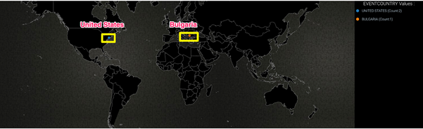 Below is an example of a user authenticating from a rare country (Bulgaria) while authenticating simultaneously from the United States. The geolocation information can be enriched to detect these scenarios.