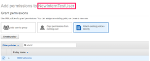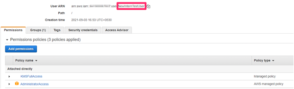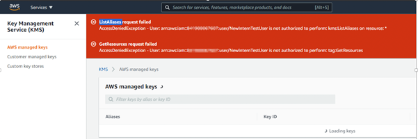 The user was therefore easily able to elevate their own privileges as shown below. The user NewInternTestUser now has additional privileges on KMS (key management) as well as administrative access.