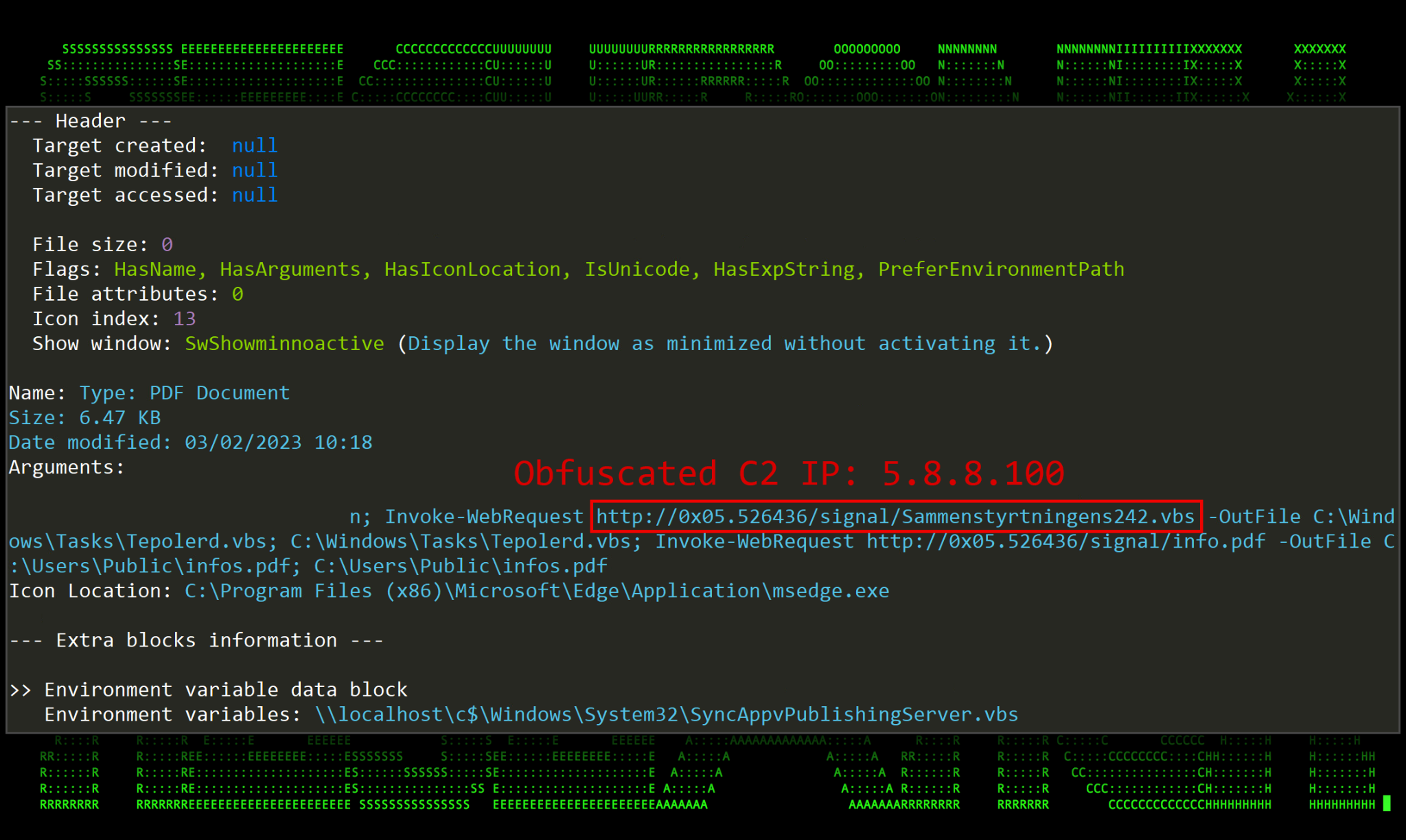 The IP address used by the attacker’s .lnk code: 0x05.526436 becomes 5.8.8[.]100