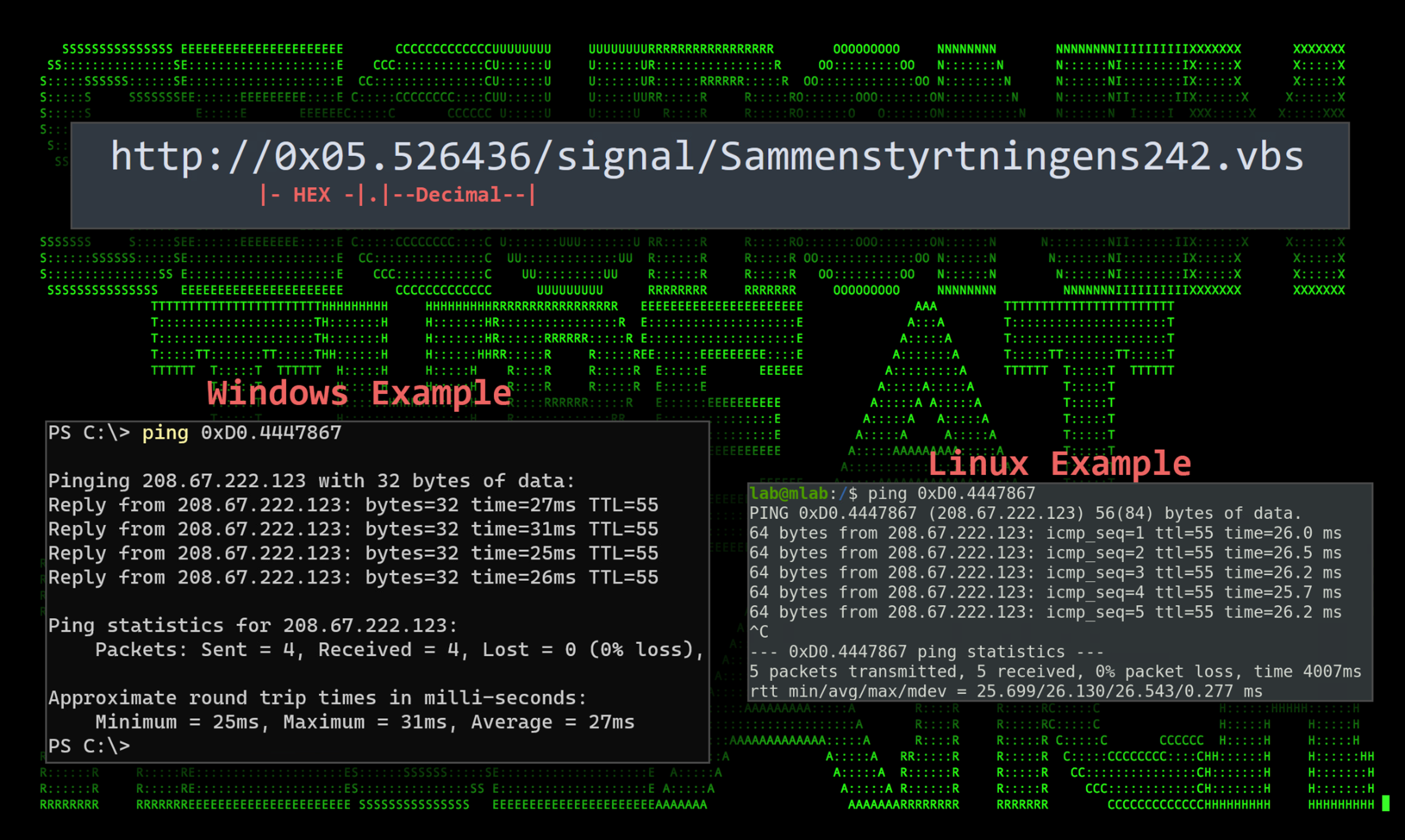 Hold up, let’s pause for a second and talk about that odd looking URL. Believe it or not, it is simply an encoded IP address and there is no DNS resolution of any kind happening behind the scenes. This IP address obfuscation method is documented, but rarely used especially when it comes to mixed notation; however, some IP obfuscation tools can be found online. If you were to copy the URL into your browser or terminal window, you’ll notice that it will be automatically translated into an IP. Let’s describe how this works using a known safer example (Open DNS): 208.67.222.123