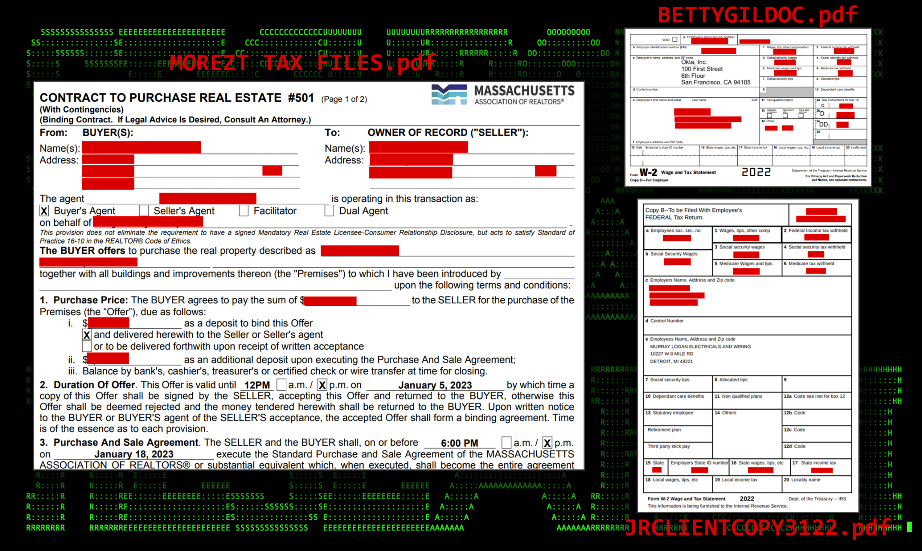 All the file samples our team analyzed were various forms of tax documents, though none could be verified as being valid. These ranged from several employee W-2 forms to I-9 documents, to real estate contracts. The two W-2 tax forms below appear to be from an Okta employee and another employee of Murray Logan Electricals and Wiring.