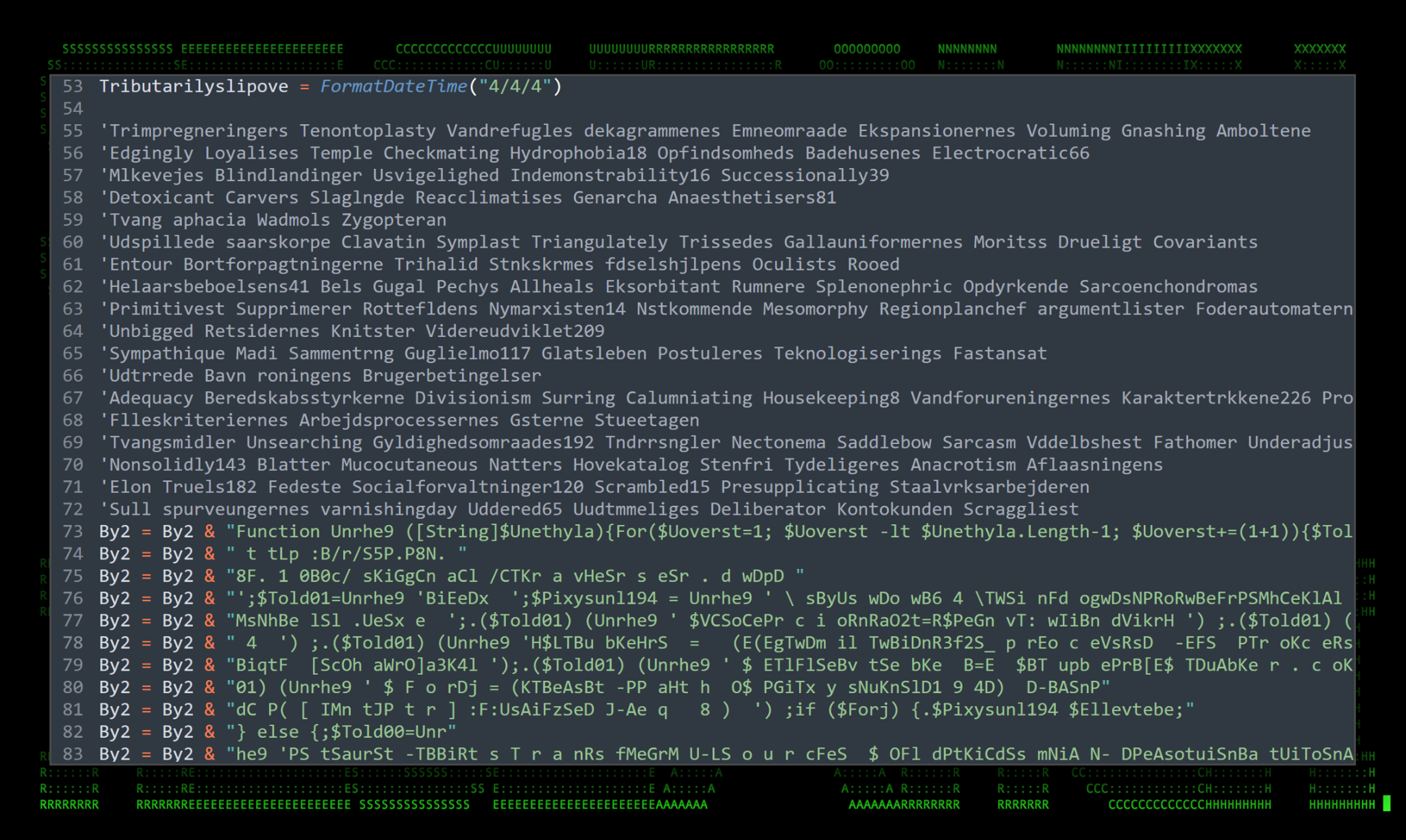 The VBS script that gets executed from the shortcut file, “Sammenstyrtningens242.vbs” is heavily obfuscated. It contains mostly nonsensical comments, likely to try to bypass or confuse AV detection.